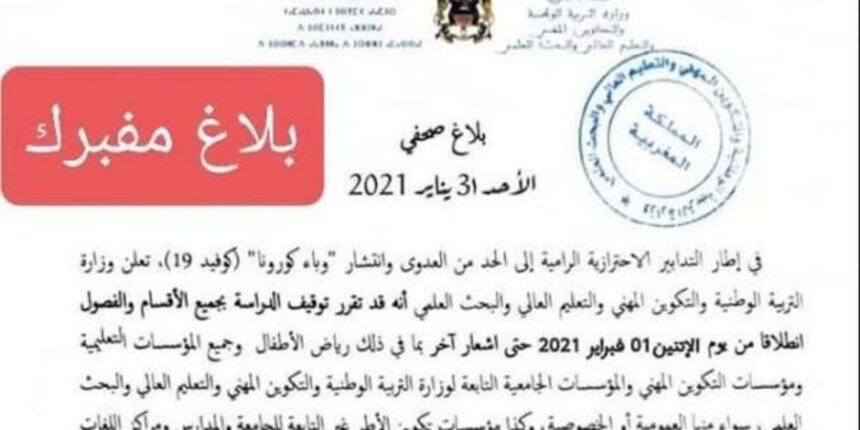 وأوضحت الوزارة في بلاغ لها “أن بعض الأشخاص، عمدوا إلى تداول بلاغ مفبرك منسوب إليها، وتنويرا منها للرأي العام الوطني والتعليمي، تنفي الوزارة نفيا قاطعا إصدار أي بلاغ بهذا الشأن كما تذكر التلاميذ والأسر على أن تستأنف الدراسة يوم الاثنين فاتح فبراير 2021”.